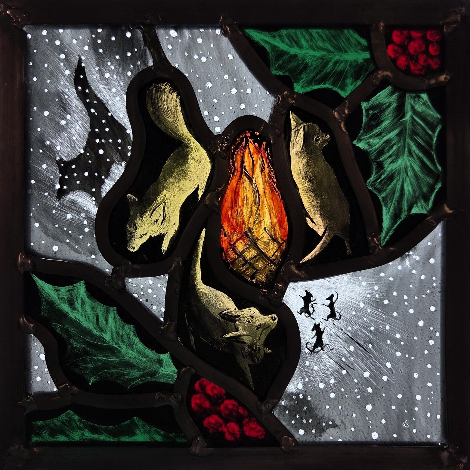 I made this little festive stained glass panel to celebrate this time of year. It features my little girls dancing around a fire in the woods. It is a celebration of the craft of stained glass, nature, my little chihuahuas and also the year that has passed.
